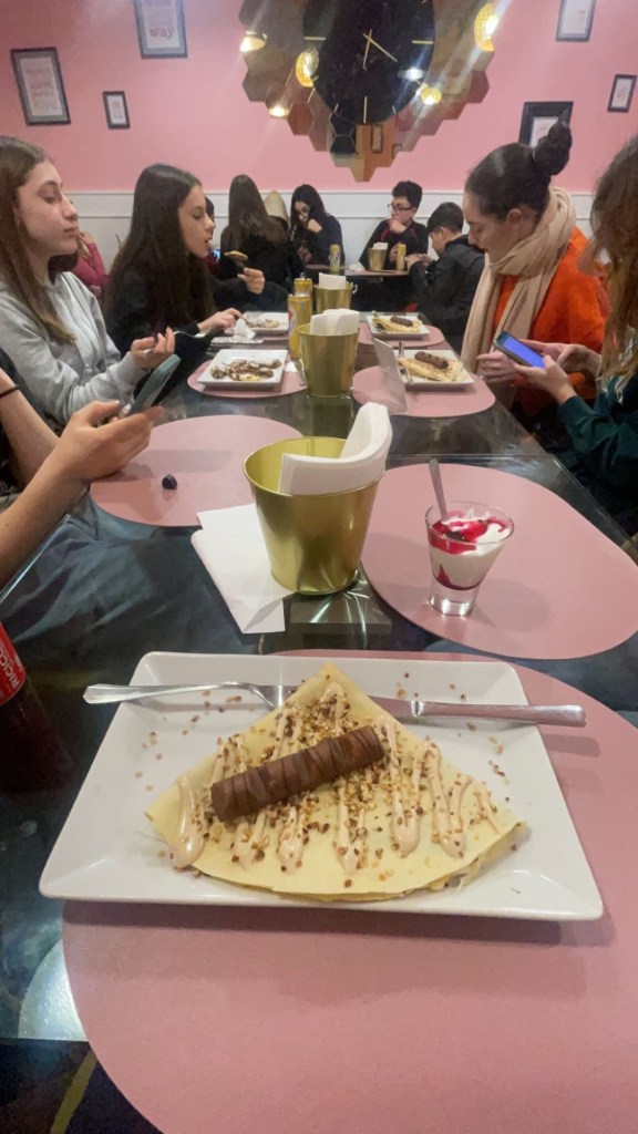 Vi gick runt i staden och åt middag på ett café med några franska elever och allas värdar. På cafét fanns det pannkakor, hamburgare, glass, våfflor och mer.Vi gick till en ungdomsgård därefter där vi kunde spela pingis och fotbolls spel.