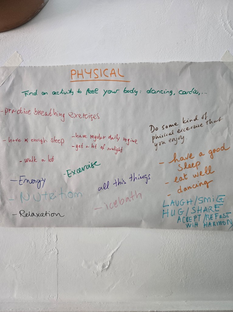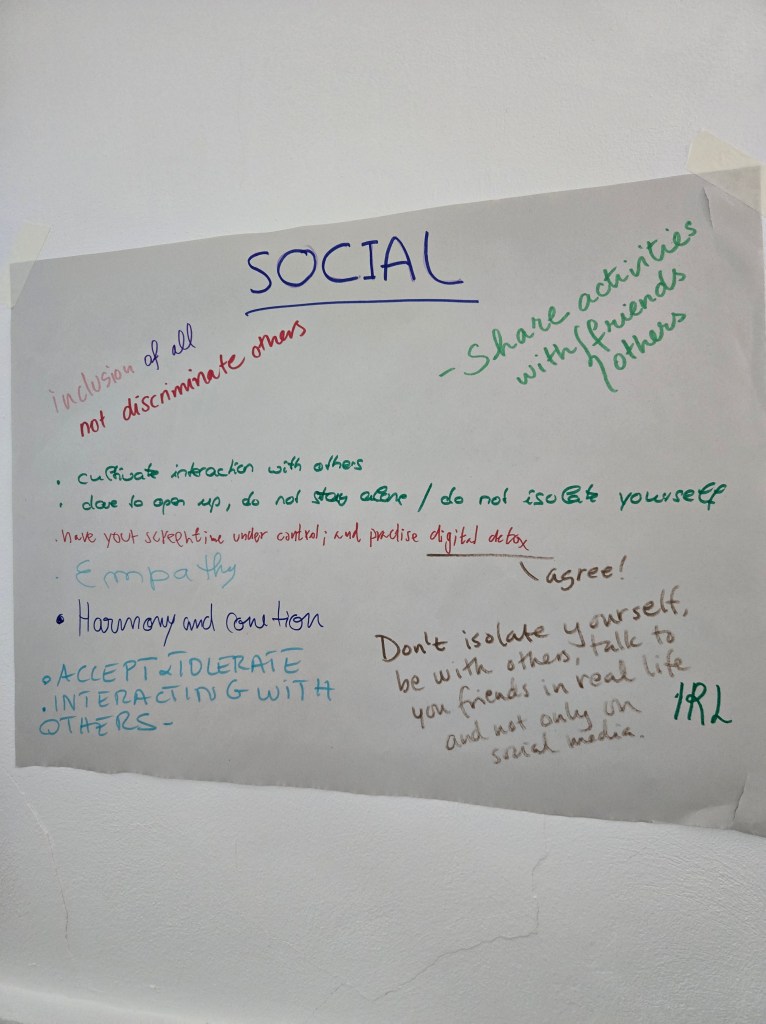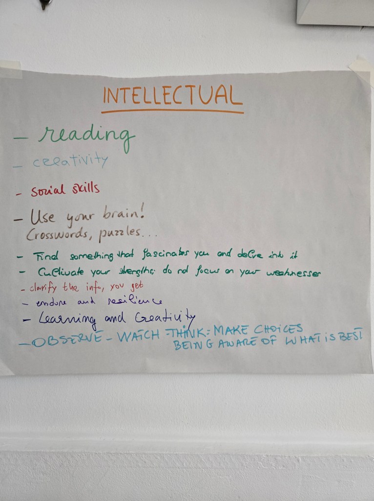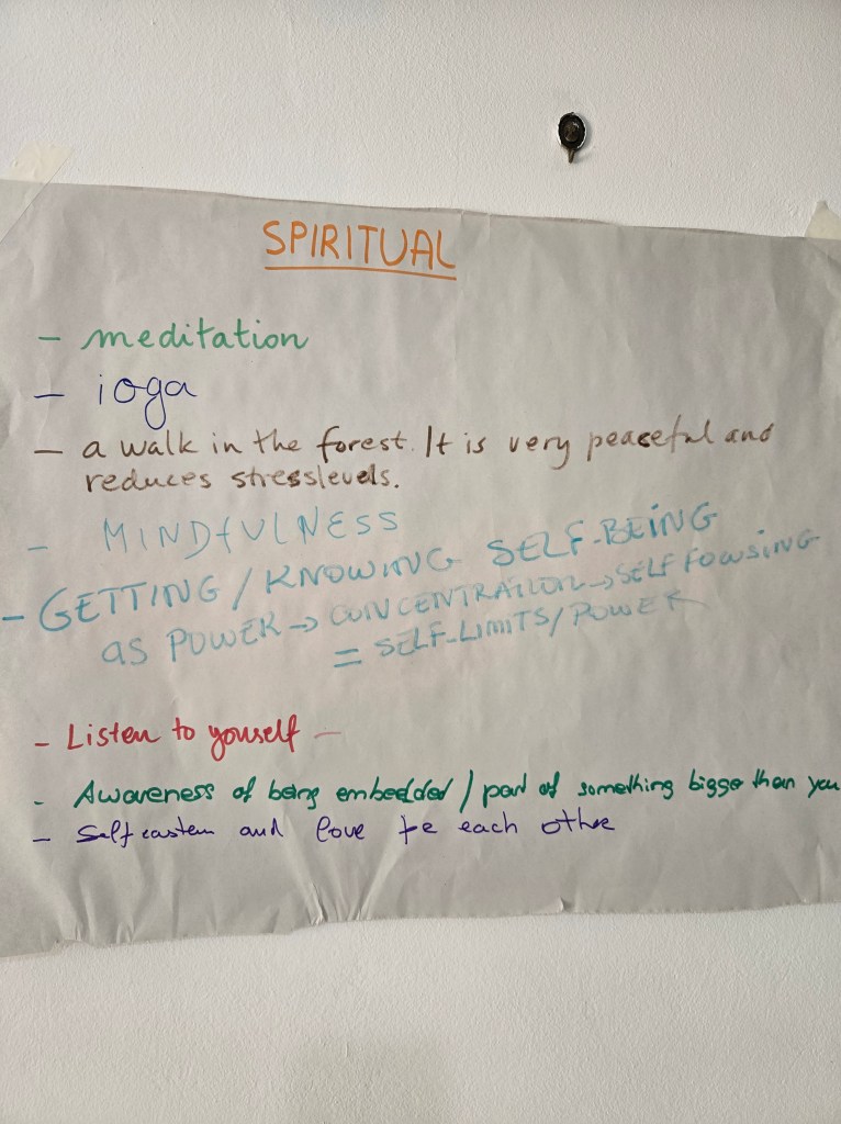 Giulia satte även upp fem posters på väggen, med rubrikerna ”Socialt” ”Intellektuellt! ”Känslomässigt”, ”Psykiskt” och ”spirituellt”. På bilderna kan ni se vad vi skrev där.