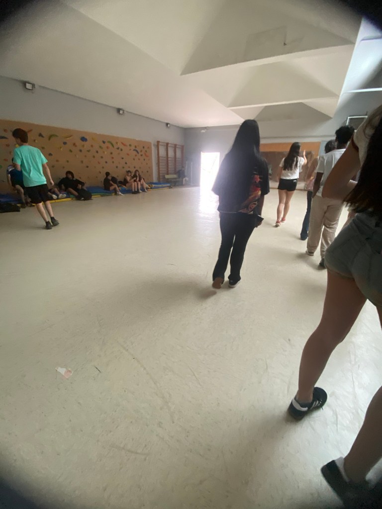 Idrottshallen var vÀldig olik den i Sverige. Den var inte sÄ superstor och det var en stor spegel pÄ vÀggen, det var ett litet förrÄd med massa saker i och alla mattor lÄg i en hög mot vÀggen.