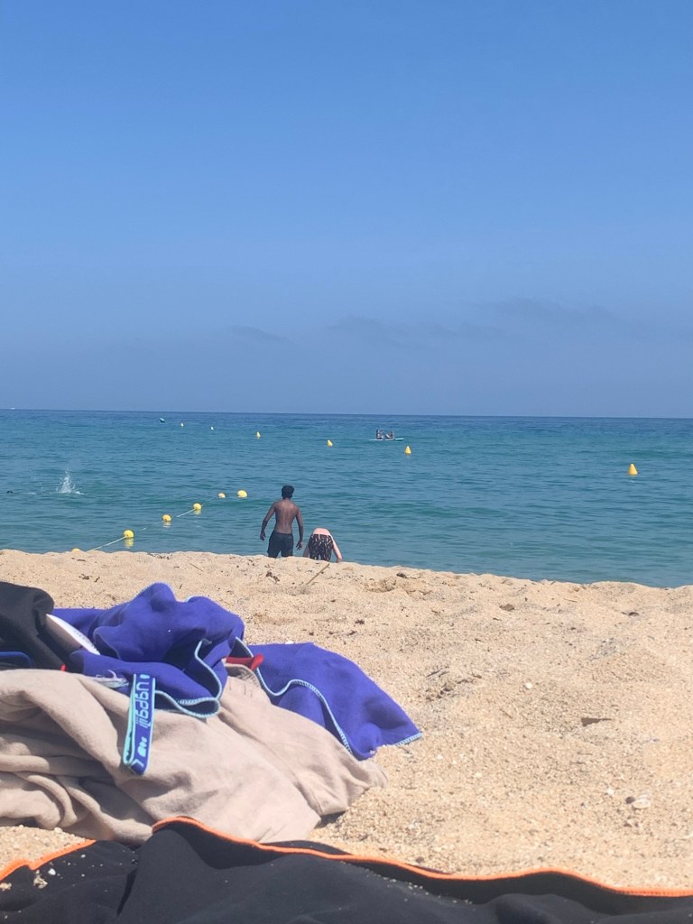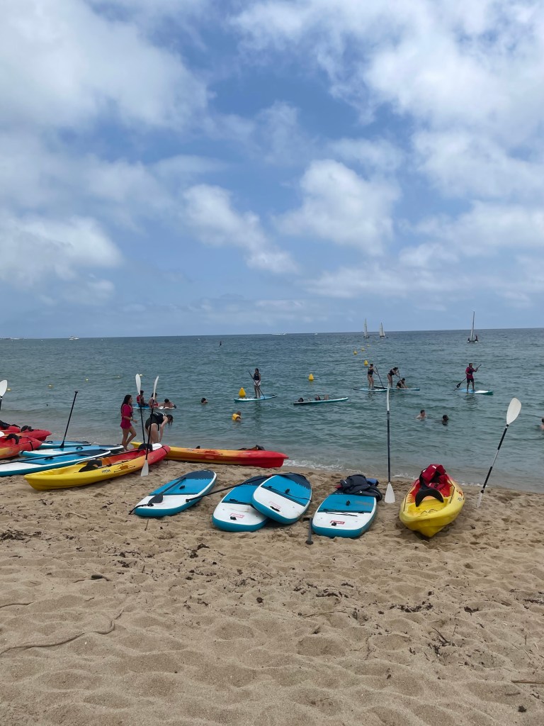 Igår tog vi ene buss till en strand i badalona🌊. Där fick vi först ta ett dopp, efter det så fick vi testa att paddla, kajak och katamaran det var riktigt kuligt. Det va kul att putta ner alla som stog på surfingbrädor😁. när vi hade gjort alla vattengrejer hade vi pick pick, det är när alla tar med sig nått litet ätbart. Vi fick också bada då och sola och jag tror alla brände sig fast vi hade solkräm😰. Sen var skoldagen slut och några stannade på stranden och brände sig ännu mer👌🏼.