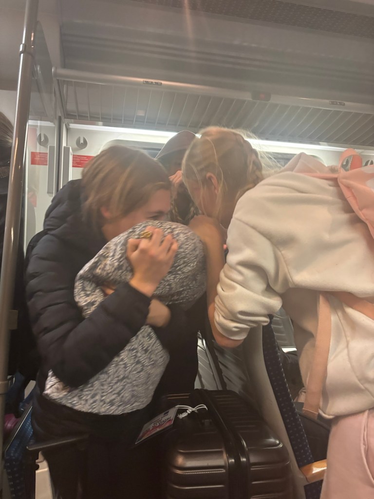 Framme om ca. 10 minuter och tjejerna börja bli nervösa över att träffa värdfamiljerna. De börja hitta på alla möjliga historier nu… men det som händer på tåget stannar på tåget 😝