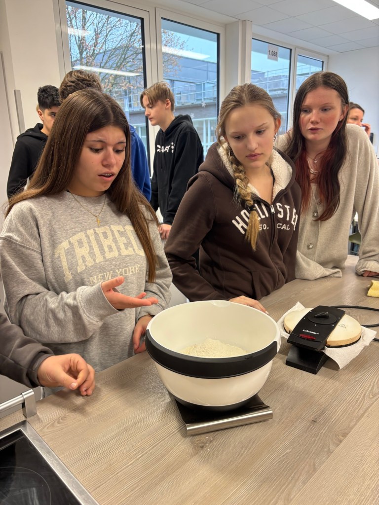 När lektionen var klar bakade vi våfflor tillsammans. Dagen avslutades med ett stadtsrally genom Rhede. Eleverna gick runt i små grupper och löste uppgifter för att lära känna staden bättre. Ett roligt sätt att upptäcka nya platser!