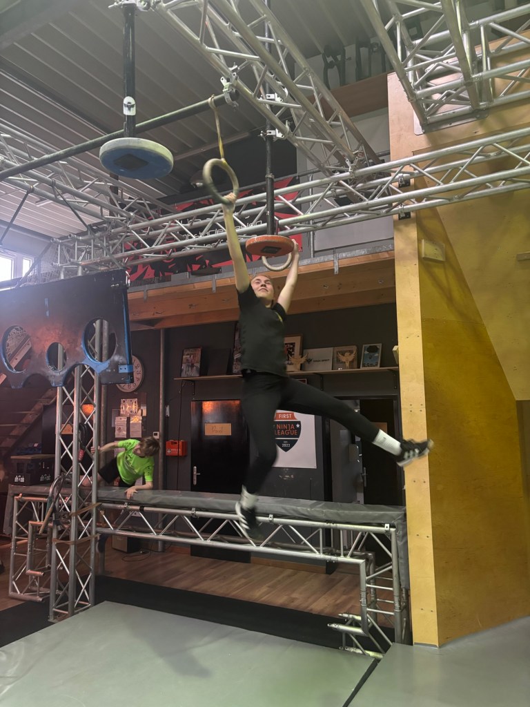 Efter förberedelserna gick vi ner på stan och åt döner 🥙. Sedan åkte vi vidare till en ninjahall, som är som en klätterhall med olika hinderbanor. Det var riktigt roligt men också väldigt svårt!