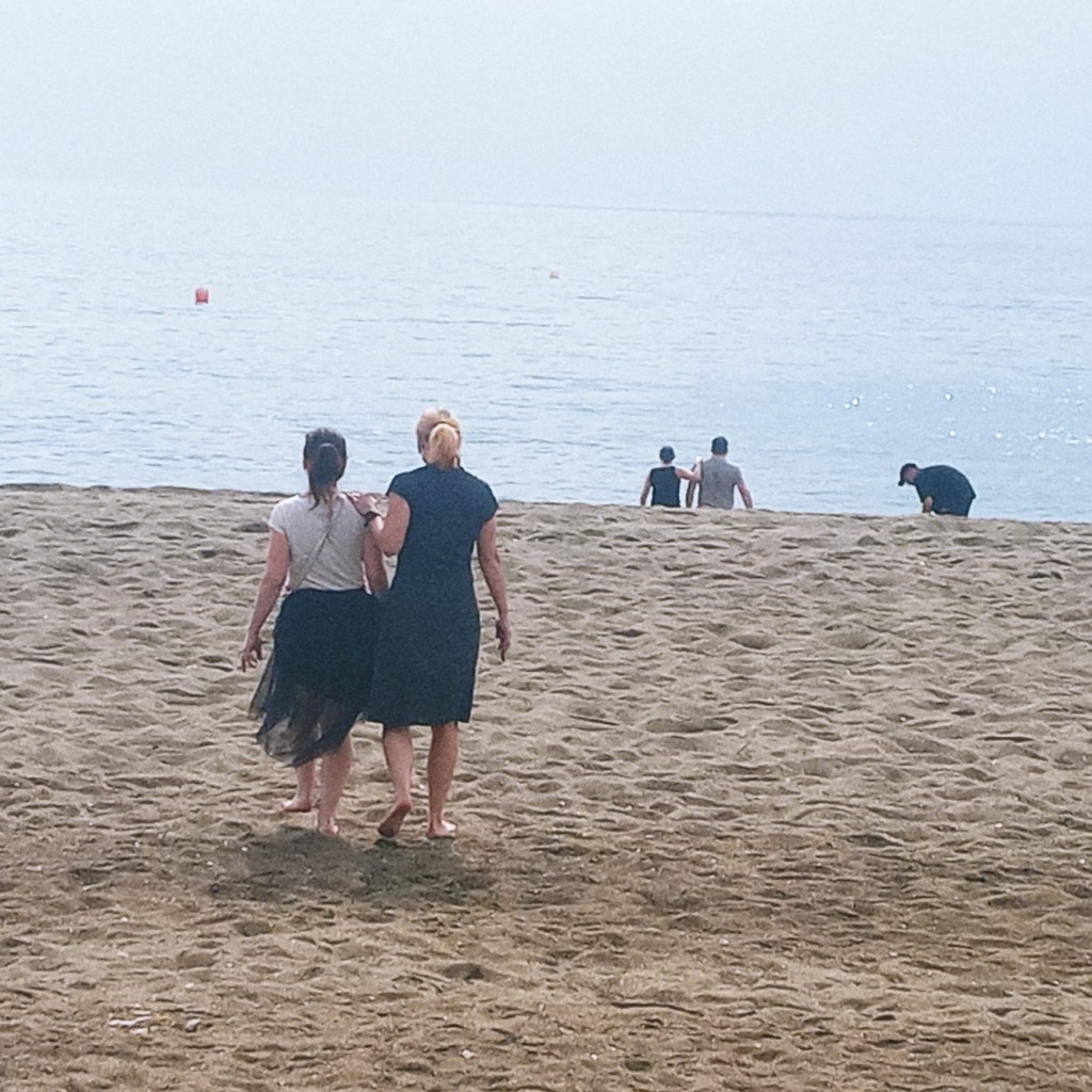 Personen på pappret är jag. Ser helt sjuk ut. 😂Från igår när vi vandrade på stranden. Monica blundar, jag leder henne. Olof och Heidi längst bort i bilden.