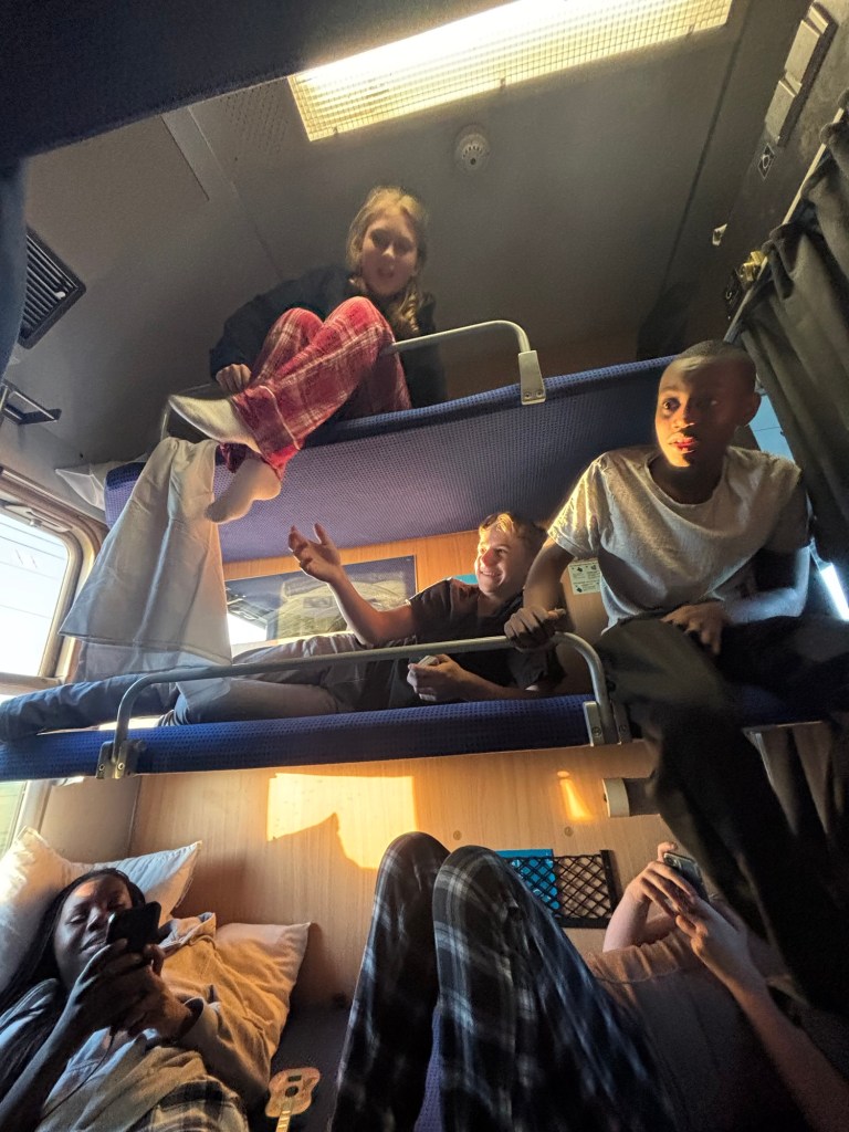 Tjeckien – Voluntärarbete Påväg till Stockholm. Vi har spelat ”finns i sjön” och yatzy. Ätit bra lunch och är redo för färden till Praha.