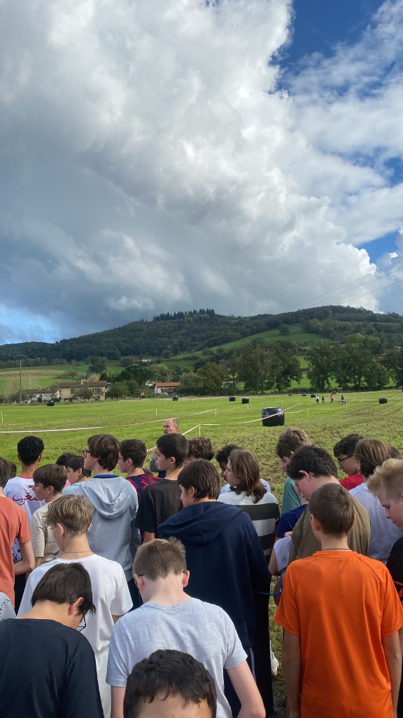 Efter lunchen hade vi lite rast och sedan var det dags att springa! Man skulle sitta ihop två och två och sen springa en bana som gick över och runt på en gräsplätt och i slutet sprang man ett varv runt skolan. Jag hade tyvärr inga idrottskläder men jag fick springa ändå. Det var jätte kul förutom att dem hade delat upp så att killar och tjejer sprang i olika omgångar, det var också väldigt lerigt och blött i gräset då det varit storm precis. Jag vek upp mina jeans så då skvätte det inte lika mycket på dem. Efter loppet fick vi alla en liten hejdå kasse med lite presenter i. Det fanns två chokladkakor, en påse godis, ett paket med kakor och en T-shirt som det stod saint foy på i en grön text och en bild från staden. Allt var jätte fint! Jag kommer sakna att vara här och alla personer men nu ser jag fram emot imorn då vi ska vara en heldag i Lyon.