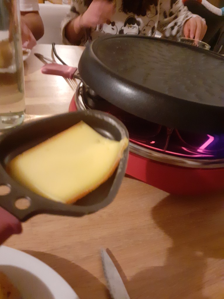 Något som jag glömde att säga igår var att vi åt något som heter Raclette som är potatis bittar med massor med ost på och några bitar skinka som man kan ha bredvid. Man smelter skinkan själv genom att lägga en bit av ost i en liten panna som man sedan sätter in i en sorts ugn. Sedan så strör man över osten på potatisen och dry blir jätte gott! Jag rekommenderar det 100%!
