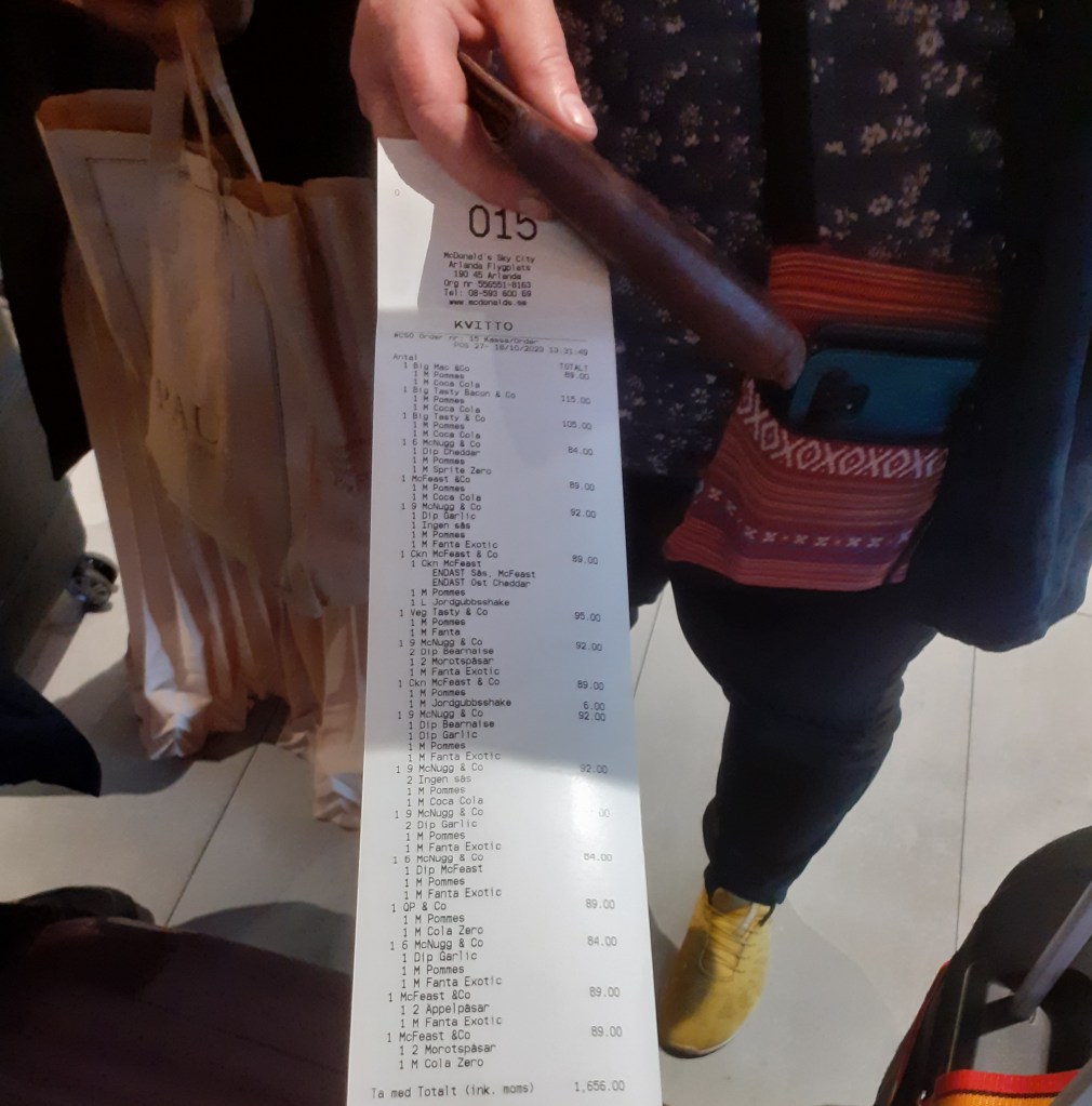 Idag så vaknade jag 3 för att komma a till flygplatsen där vi skulle samlas för at sedan flyga till Paris, för att senare flyga till Arlanda. Vi åt lunch i Arlanda och alla fick bästella en meny från donken, och kvittot blev as lång för Erasmus betalade för det.