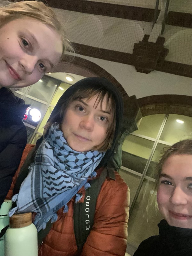 Då vi var på tågstationen i Hamburg så gick vi omkring på vissa ställen och åt McDonalds, men sedan så körde några kull och försökte nudda lampor och sånt. Men sedan så såg Thula självaste Greta Thunberg som vi tog bild med.