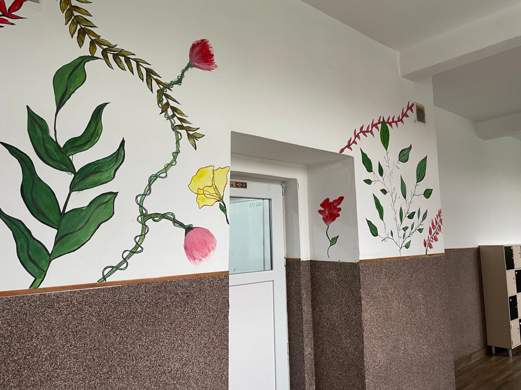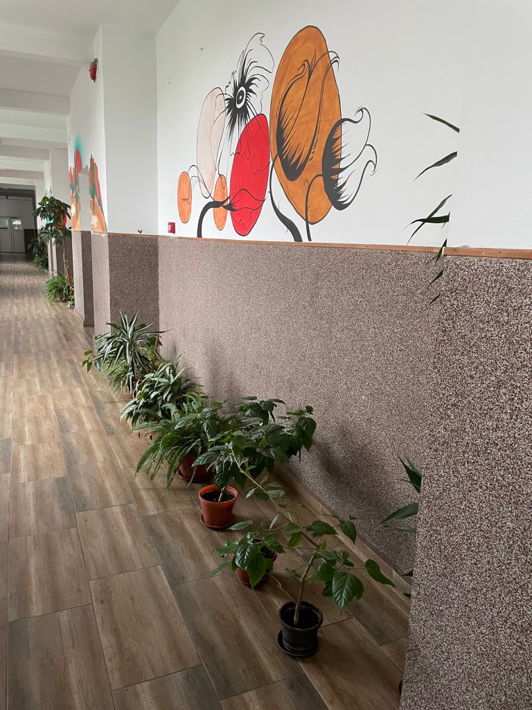 Några bilder från vår rundvandring på skolan. Varje klass har sitt hemklassrum. Fint att se alla blommor och konst som fanns i skolan. Blommor överallt, i korridorer, i fönstren, i trapporna, i klassrummen… så även med konsten. Dom pratade sig varm om sin bildlärare. Han har gjort all konst vi ser i skolan med sina elever.