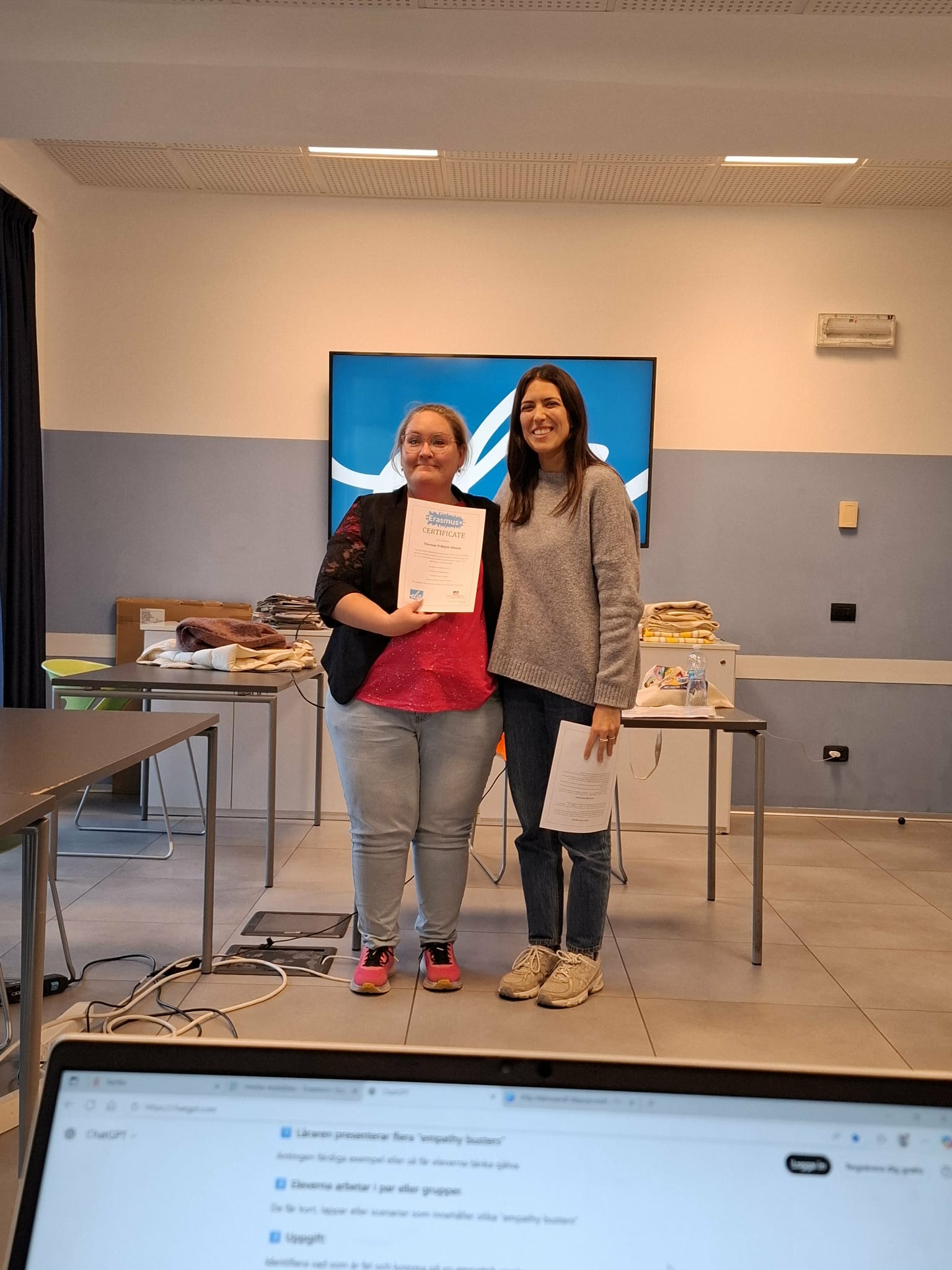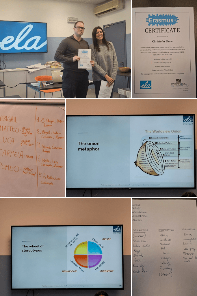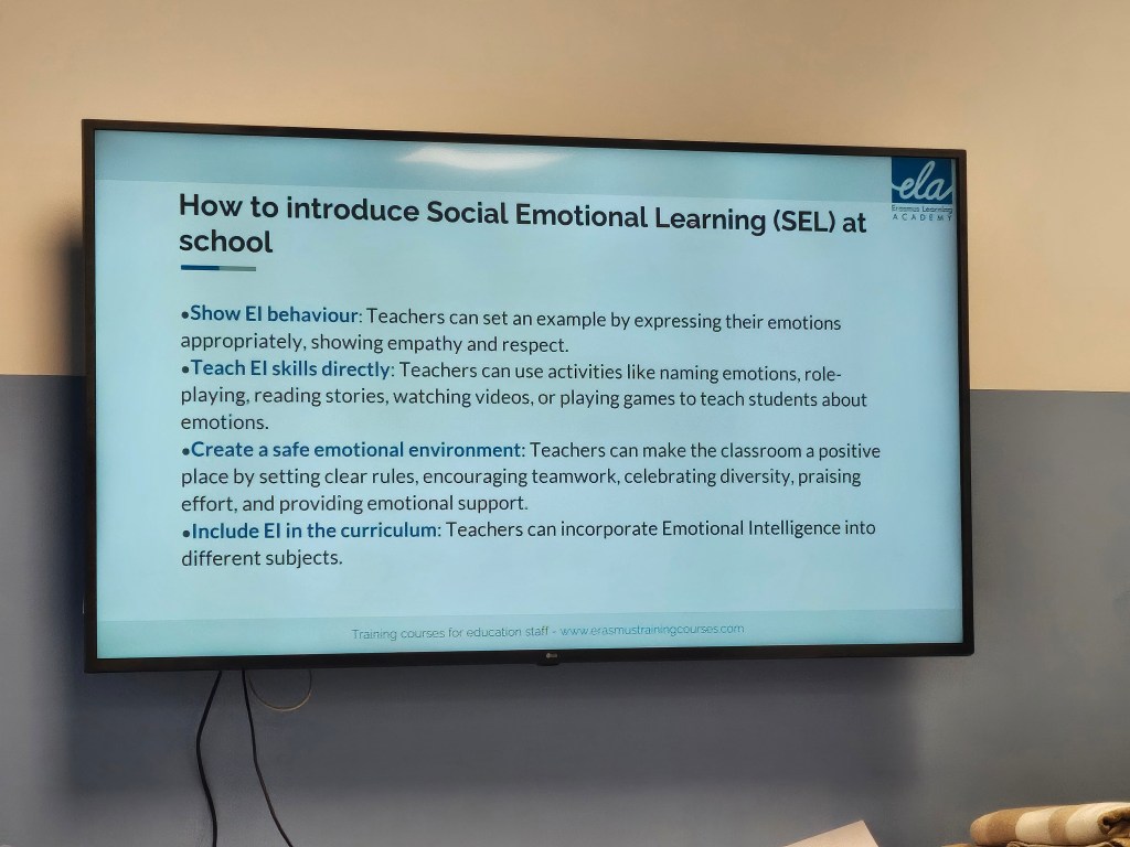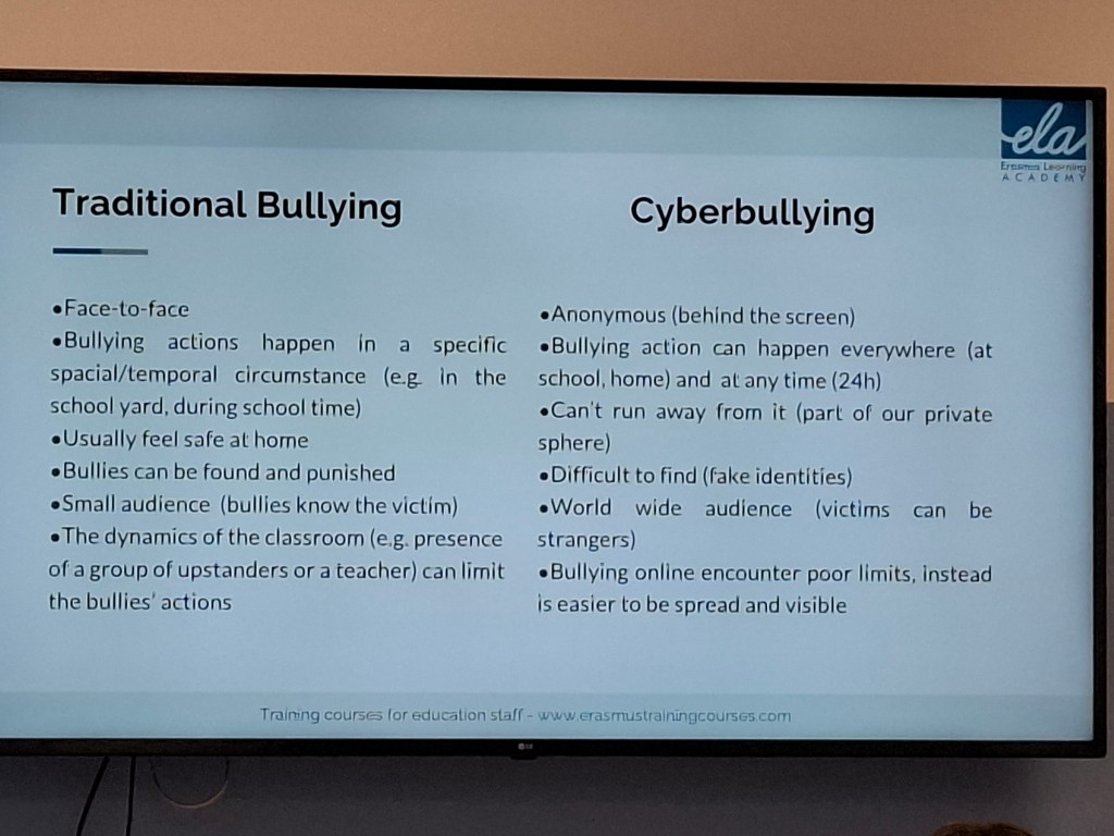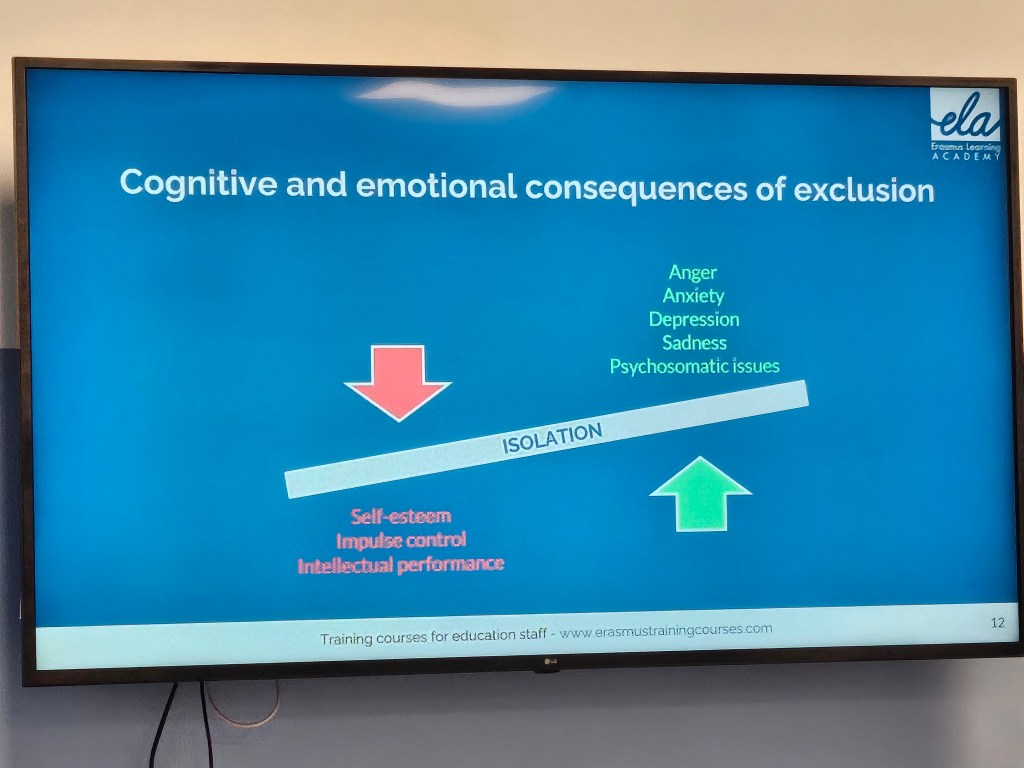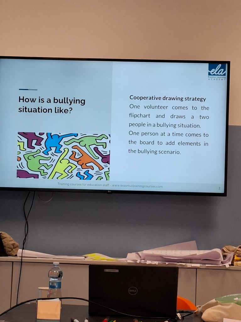 Mina tankar efter kursen, att den blev över förväntan. Jag föreställde mig mycket envägs kommunikation men så blev det verkligen inte. Kursen har haft en perfekt blandning av summering av gårdagen, information, övningar, diskussioner och såklart roliga konversationer om hur saker och ting fungerar i Malta, Spanien/Portugal, Italien och Sverige. Det jag främst tar med mig är hur viktigt det är att skapa en trygg miljö för eleverna, att de blir trygga med varandra för att förhindra mobbing och att detta är något som måste göras på regelbunden basis.