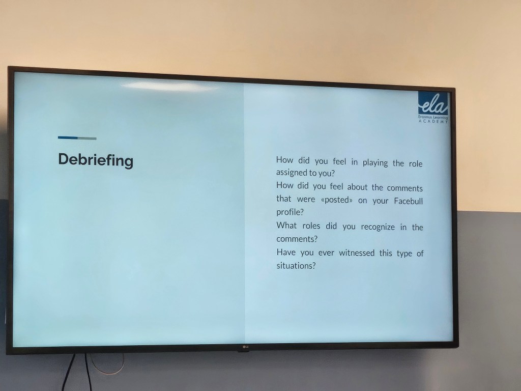 Tredje dagen av kursen började vi som vanligt att titta tillbaka på vad vi gjorde sist med en så kallad word – map. Vi fick ordet Cyberbullying och vi skulle hitta ett ord till varje bokstav som hade med gårdagens program. Ett intressant sätt att göra en tillbakablick. Sedan började dagens program. Det handlade mycket om känslor denna dag om hur vi kan arbeta kring känslor som kan uppstå genom mobbning och annat. Vi gjorde två övningar som stack ut och den ena kallades awareness/empathy map. Den gick ut på att alla skrev ett scenario av en händelse utan att avslöja känslorna hos personen och då skulle vi sedan sitta i grupp och diskutera fyra saker från dessa scenarier. De var Emotion, Think, Say och Do från personens perspektiv. Den andra var att klippa ut tre känslor från en tidning och de andra skulle gissa vilken känsla det var och kolla med mig vilket ord jag hade tagit. Atlas of emotions och Putchick flower wheel emotions var två verktyg vi lärde oss för att kunna förstå känslor bättre. En lärorik dag 3!