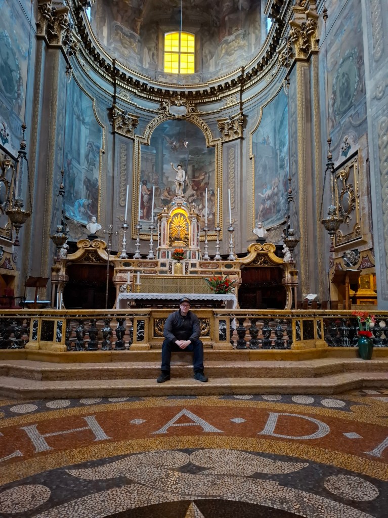 Vi fick efter kursen en ny guidad tur genom Bologna som var lite mer historiskt lagd. Väldigt intressant då vi besökte San giovanni in monte som är en kyrka men under andra världskriget så var byggnaden intill ett kvinnofängelse vilket var intressant att höra om. Vi besökte även den äldsta universitetsbyggnaden i Bologna vilket var riktigt häftigt. Det var en massa annat vi också fick besöka och se. Mycket lärorikt och på bilden så sitter jag inne i en av de kyrkor vi besökte vilket var otroligt stort och häftigt.