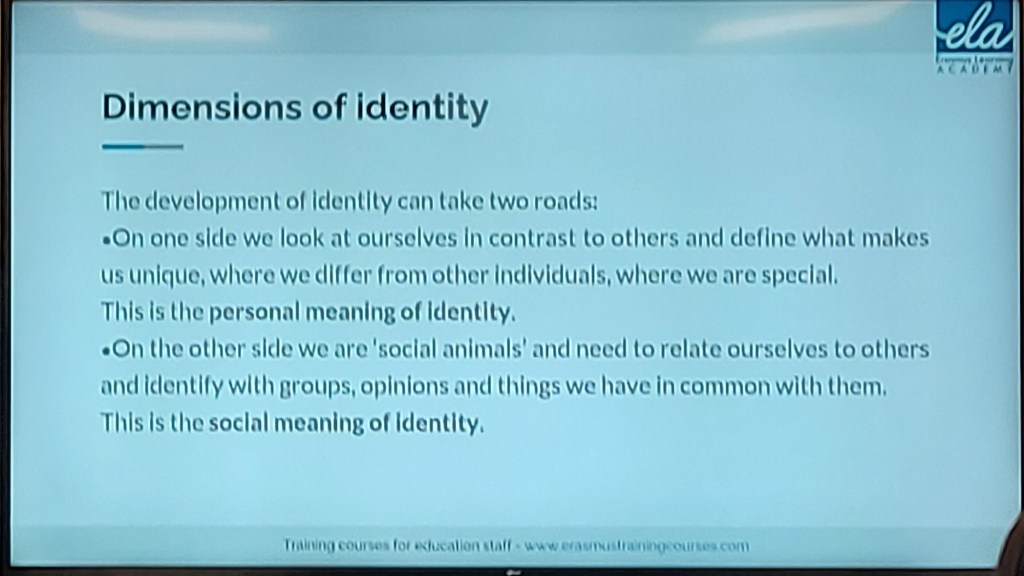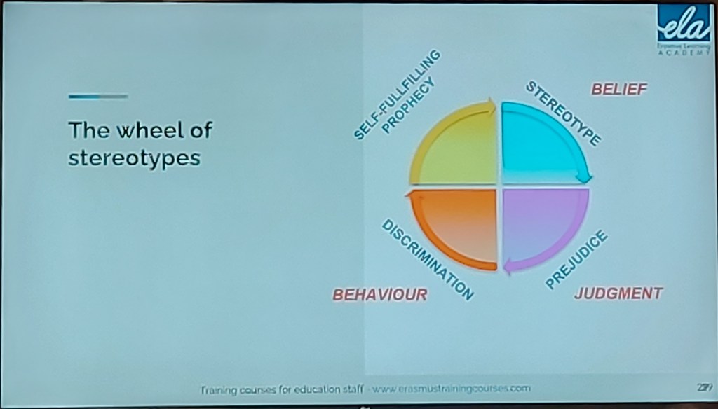 Sista dagen av kursen avslutades på ett bra sätt. Vi började dagen som vanligt med en övning genom att använda ett program som heter baamboozle och genom det fick vi välja ett nummer med en fråga som tillhörde den. Sedan kom vi in på dagens program som handlade mycket om stereotyper och identitet. Mycket bra blandning med aktivitet och kunskap. En sak jag tyckte var intressant som stack ut lite för mig var en övning som kallades Abigails sad love story. Den gick ut på att vi fick lyssna på en berättelse som involverar fem personer och våran uppgift var att titta på varje karaktärs beteende och sedan rankade vi de från bäst till värst. Det ledde till intressanta diskussioner då vi alla tänkte inte likadant om deras beteende. Det var även hel del intressanta diskussioner och aktiviteter kring identitet, värderingar och fördomar. I slutet av kursen fick vi vårat certifikat som vi kan vara stolta över! 🙂 Fantastisk kurs och ett tack till en super duktig kursledare (Valeria).