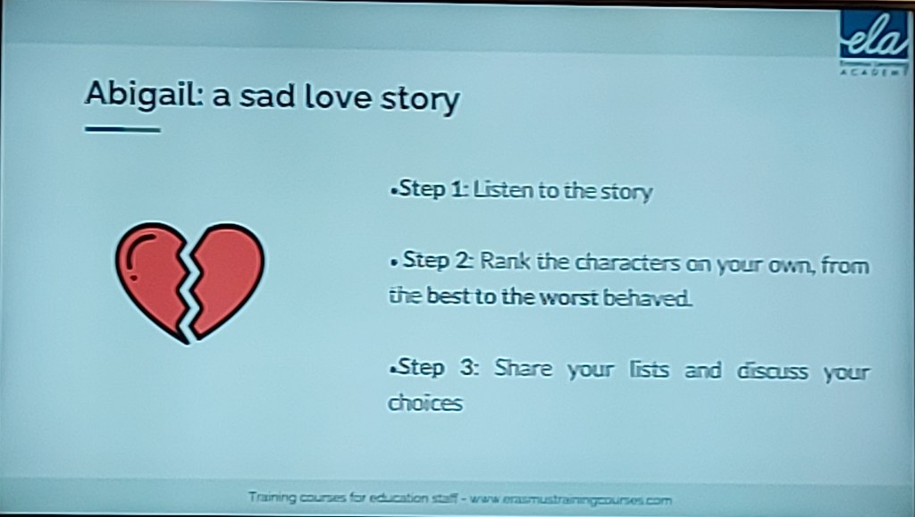 Vi gjorde även en väldigt intressant värderingsövning som handlade om den förälskade Abigail, där såg vi verkligen hur en berättelse kan tolkas och värderas olika beroende på bakgrund och tidigare erfarenheter.