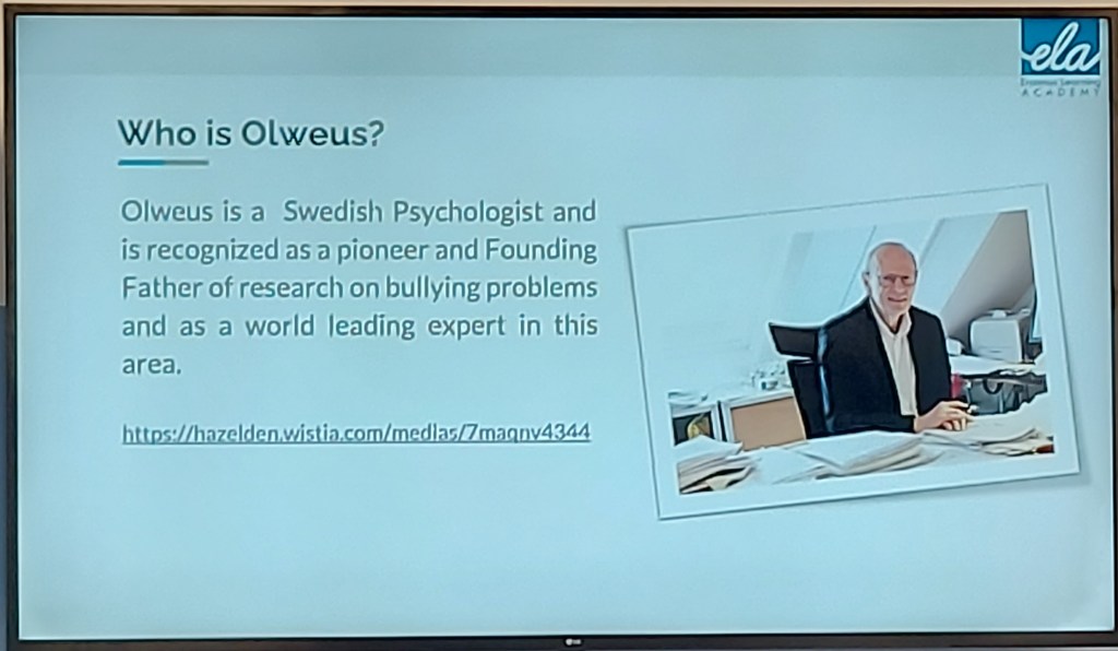 Vi fick även bli lite lokalpatriotiska då forskning av den svenska psykologen Dan Olweus togs upp som grunden till mycket av det som används för att motverka mobbing idag.