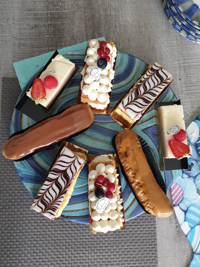 Célines pappa har varit kock på flera restauranger i Paris och har även haft en egen i Normandie i över 30 år. Middagen var, som alltid här, i fyra rätter. Förrätten bestod av baguette med massa olika röror – himmelskt gott! Varmrätten var marinerad kycklingfilé med varmt äpple och krispiga potatiskuber (mmm!). Sen kom osten – alltid tre olika sorter – och till sist en rabarberpaj. Alltså… jag hade lätt kunnat äta upp hela pajen om jag inte varit så mätt!