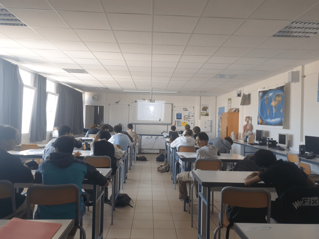 Första lektionen var historia och då fick jag möta historia-läraren för första gången och han känns som en snäll lärare. Han förklarade att de pratade om hur Frankrike blev en demokrati efter deras revolutioner. Jag förstod faktiskt några meningar som stod på tavlan. Jag blev stolt på mig själv. På mattelektionen hade de en genomgång på algebra och det var allt som de hann med på den timmen.